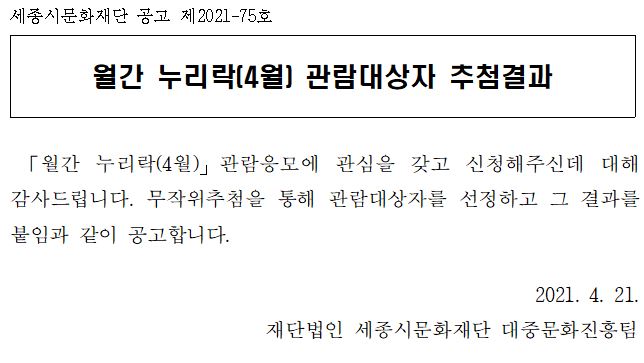 공고 월간 누리락(4월) 관람대상자 추첨결과 공고