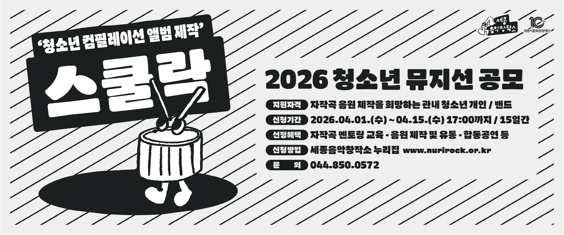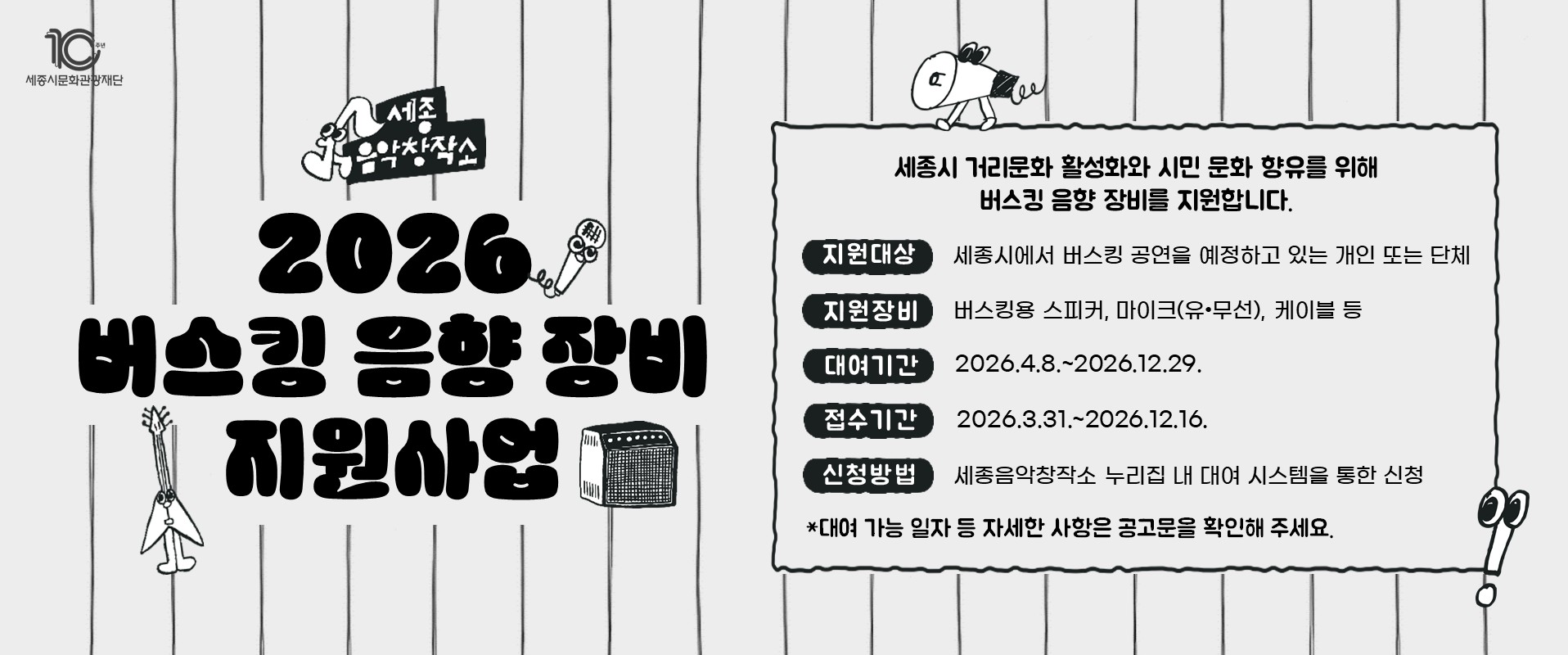 공지사항 2026.03.08 [공고] 2026 '아마추어 밴드 지원' 누리락밴드 참여자 모집 (3.9.~3.23.) 2026.02.24 [공고] 2026 뮤즈세종 뮤지션 모집 (2.27.~3.13.) 2026.01.19 [타기관홍보] 제2회 원주 전국 밴드 페스티벌 2025.11.21 2026년 「세종음악창작소 누리락」 상반기 공연장 정기대관 승인 공고 2025.11.03 「세종음악창작소 누리락」2026년 상반기 정기대관 공고