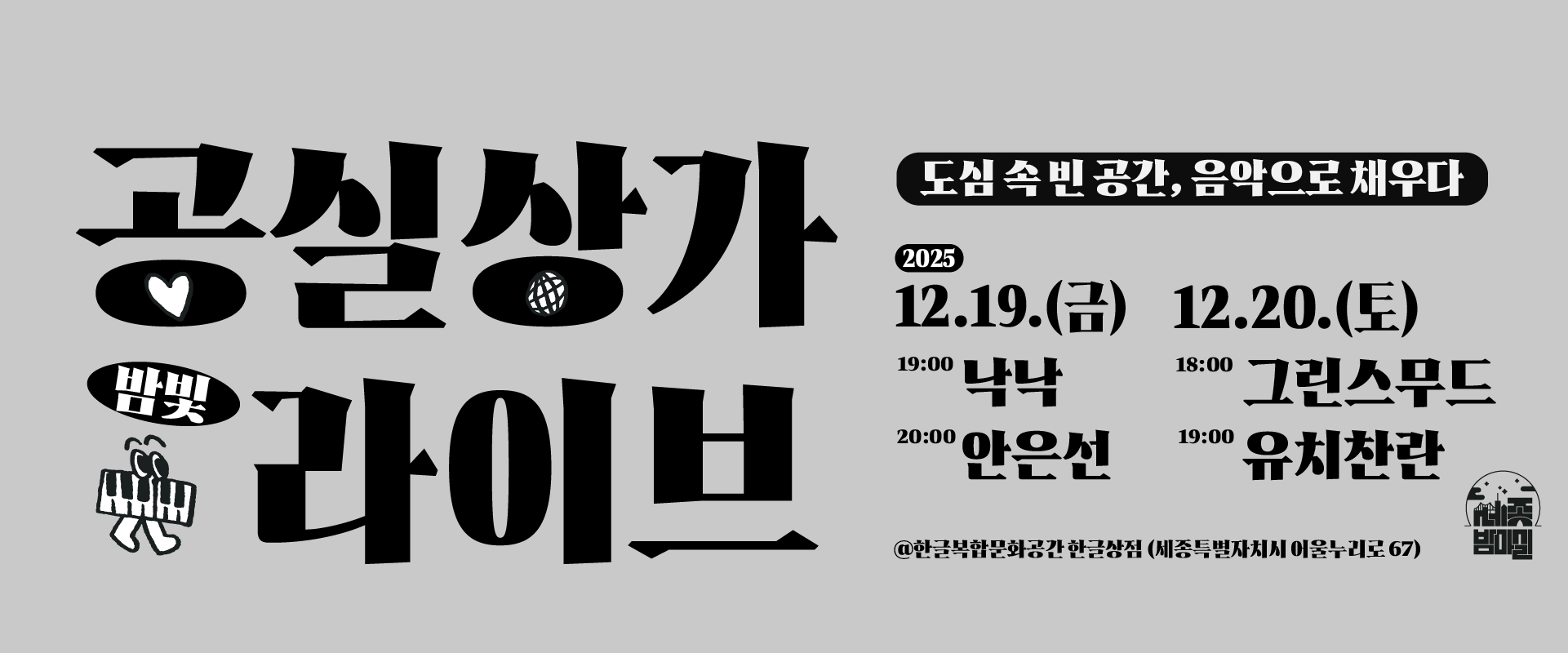 사이트 전체메뉴 닫기 지원사업 뮤즈세종 누리락밴드 스쿨락 공연/아카데미 디깅라이브세종 뮤즈세종 쇼케이스 클럽 라이브 대중음악 아카데미 프로그램 일정 SBMF ABOUT 2025 SBMF 2024 SBMF 공간/대관 공간소개 대관안내 대관신청 무대기술자료 대관공연 일정 아카이빙 뮤지션 음반 라이브클립 영상/사진 소개/커뮤니티 운영개요 직원/업무 오시는 길 공지/공고 부가서비스 회원가입 로그인 아이디/비밀번호 찾기 개인정보처리방침 저작권보호정책 이용약관 이메일무단수집거부 마이 페이지 회원정보 회원탈퇴 NOL티켓 예매내역 아카데미 신청 내역 대관 신청 내역 공연 예매 내역 무료공연 신청내역