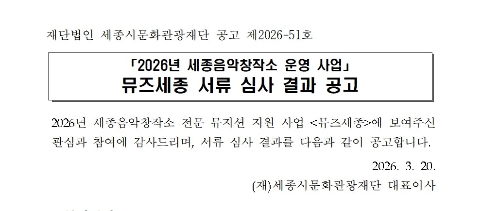 공고 2026 뮤즈세종 뮤지션 서류 심사 결과 공고